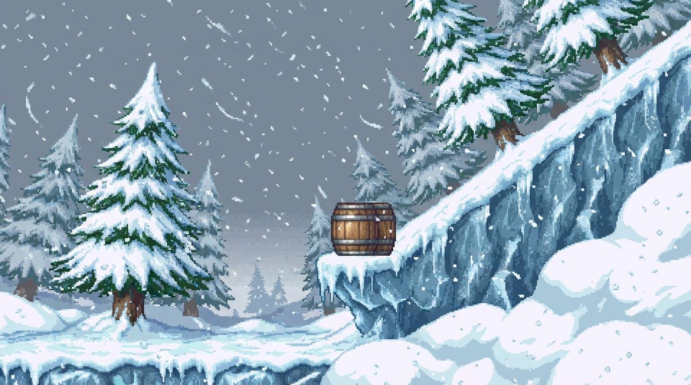 スーパードンキーコング(SFC版)のホワイトマウンテンの最初のステージ「ふぶきの谷」の攻略ガイドです。ボーナスステージ、ライフバルーン、ショートカットの場所と取得方法を詳しく解説します。